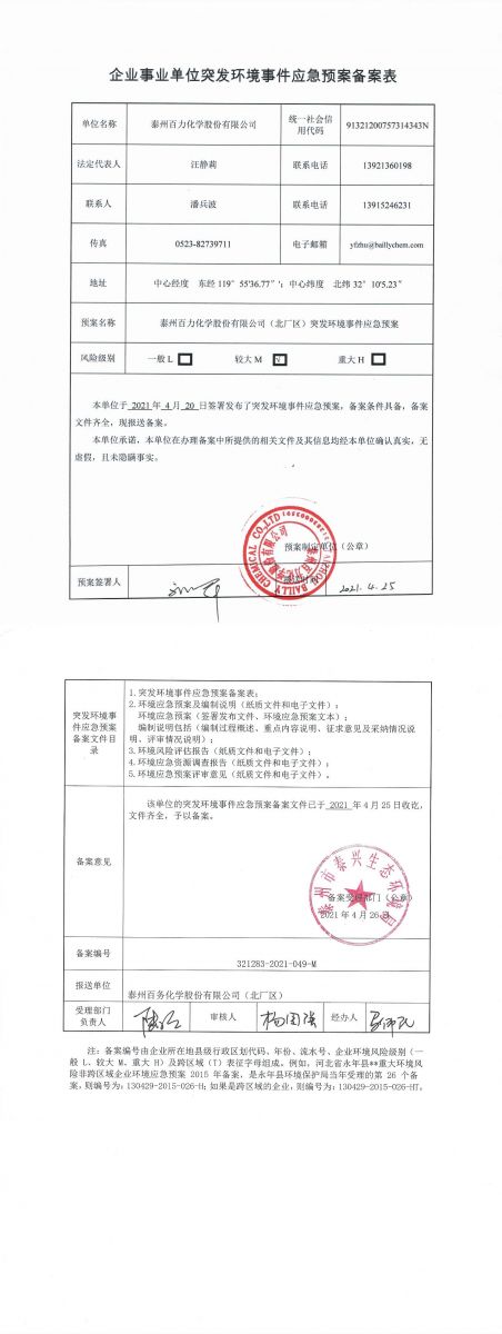 泰州百力化學(xué)股份有限公司(北廠(chǎng))突發(fā)環(huán)境應急預案備案登記表