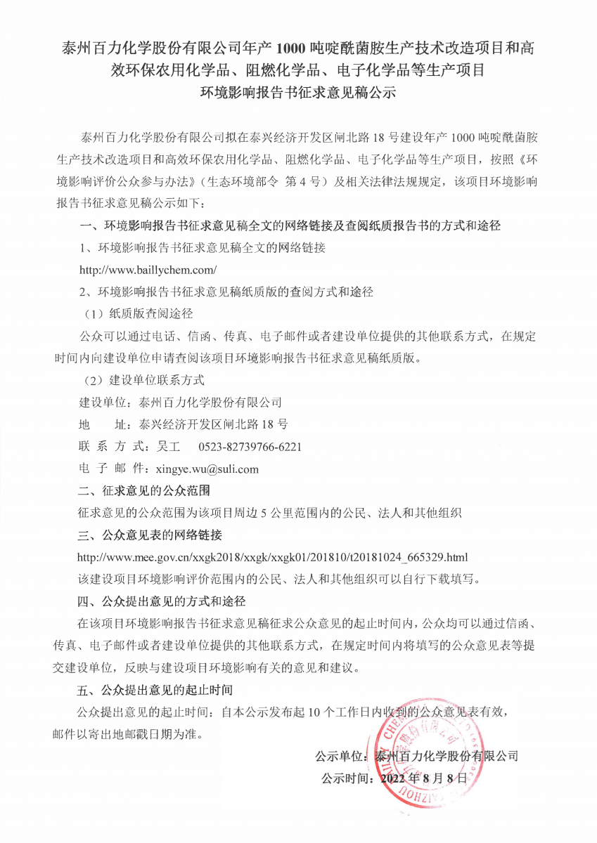 泰州百力化學(xué)股份有限公司年產(chǎn)1000噸啶酰菌胺生產(chǎn)技術(shù)改造項目和高效環(huán)保農用化學(xué)品、 阻燃化學(xué)品、 電子化學(xué)品等生產(chǎn)項目 環(huán)境影響報告書(shū)征求意見(jiàn)稿公示