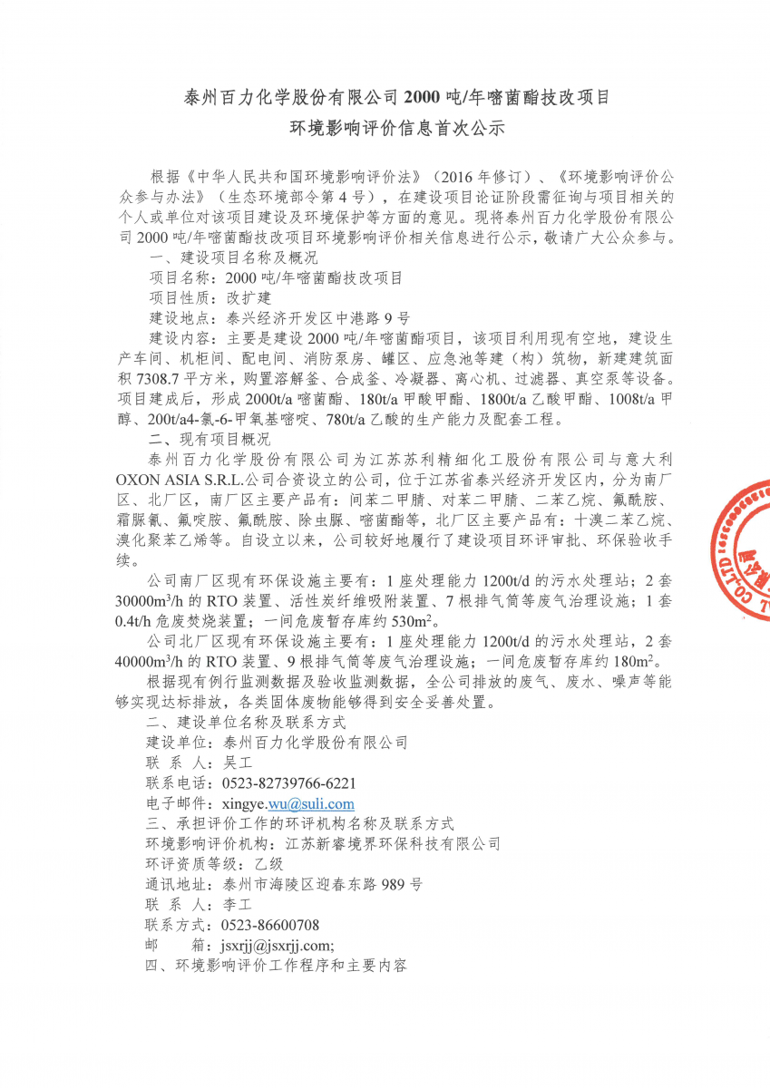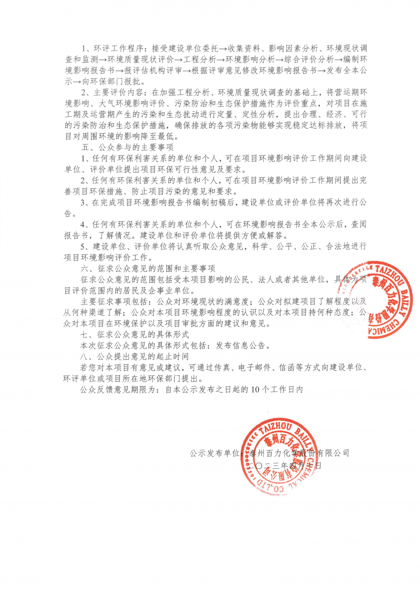 泰州百力化學(xué)股份有限公司首次環(huán)境影響評價(jià)信息公示