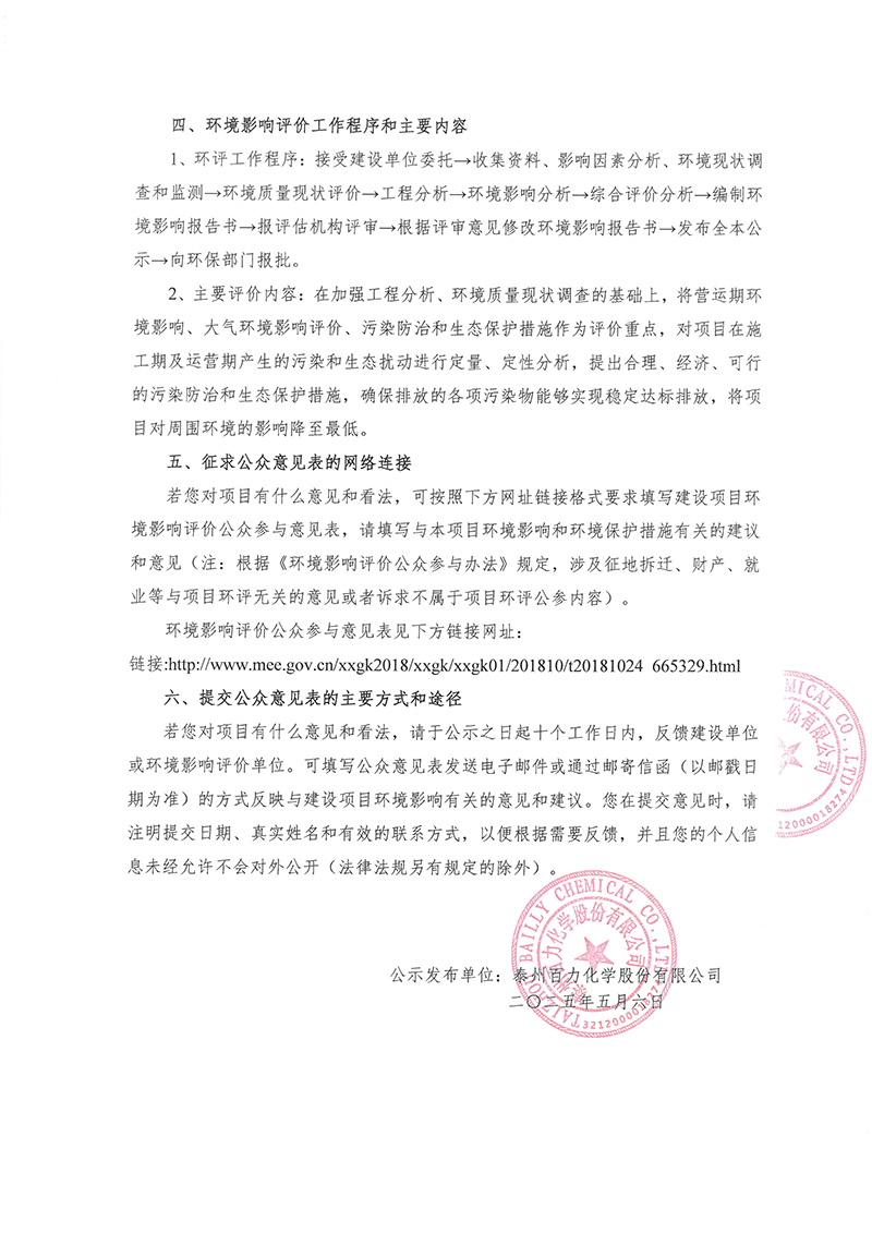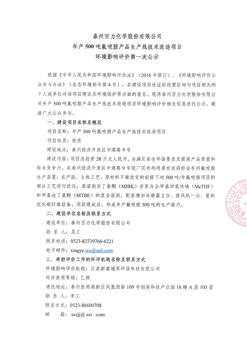 泰州百力化學(xué)股份有限公司年產(chǎn)500噸氟啶胺產(chǎn)品生產(chǎn)線(xiàn)技術(shù)改造項目 環(huán)境影響評價(jià)第一次公示